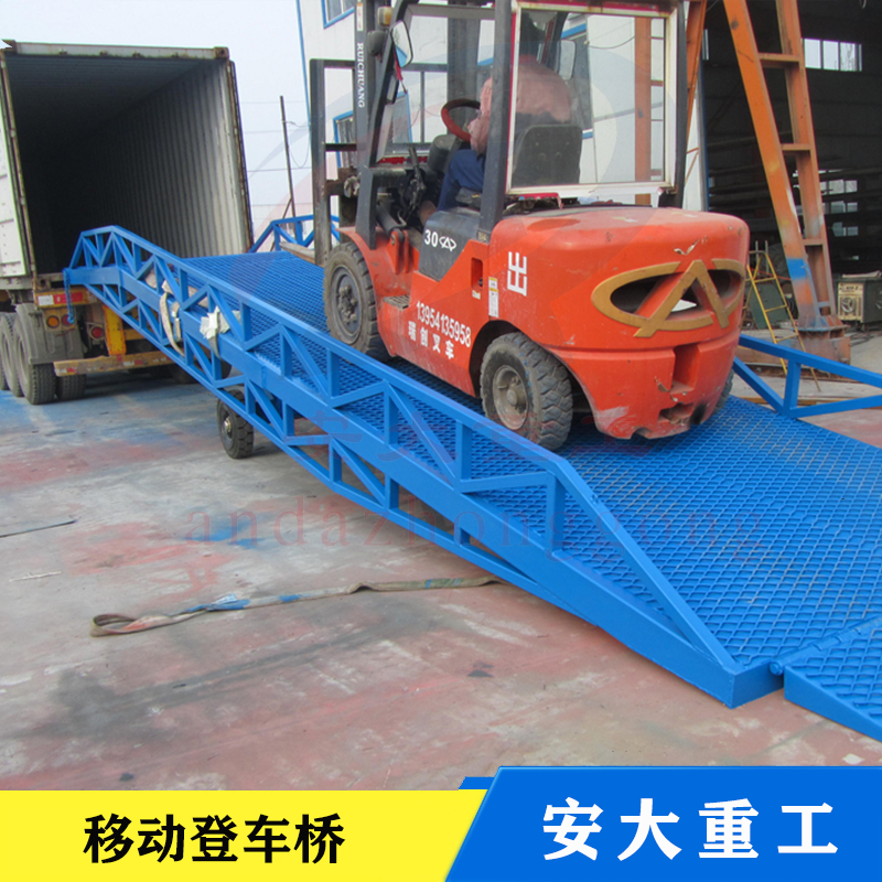 移動式登車橋是與叉車配合使用的貨物裝卸輔助沒備,可根據(jù)汽車車用的高低調(diào)節(jié)高度,叉車可以直接通過本設(shè)備駛?cè)胲噹麅?nèi)部進行貨物的批量裝卸,需單人作業(yè),即可實現(xiàn)貨物的快速裝卸。它使企業(yè)減少大量勞動力,提高工作效率,獲取經(jīng)濟效益。